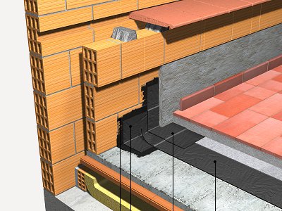 Encuentro de cubierta plana transitable, ventilada, con solado fijo, tipo convencional con paramento vertical; mediante la realización de un retranqueo perimetral de más de 5 cm con respecto al paramento vertical y de más de 20 cm de altura sobre la protección de la cubierta, relleno con mortero de cemento, industrial, M-2,5 colocado sobre la impermeabilización soldada a su vez al soporte y formada por: banda de refuerzo de 50 cm de anchura, realizada a partir de lámina de betún modificado con elastómero SBS, LBM(SBS)-40-FP, con armadura de fieltro de poliéster no tejido de 160 g/m², de superficie no protegida, totalmente adherida al soporte con soplete, previa imprimación con emulsión asfáltica aniónica con cargas tipo EB. Remate con banda de terminación de 50 cm de desarrollo con lámina de betún modificado con elastómero SBS, LBM(SBS)-40-FP, con armadura de fieltro de poliéster no tejido de 160 g/m², de superficie no protegida, acabado con un revestimiento de rodapiés de gres rústico, de 7 cm, 3 €/m colocados con junta abierta (separación entre 3 y 15 mm), en capa fina con adhesivo cementoso, C1 TE, según UNE-EN 12004, con deslizamiento reducido y tiempo abierto ampliado, Tixobond White "MAPEI SPAIN", color blanco, a base de cemento, áridos de granulometría seleccionada, resinas sintéticas y aditivos especiales y rejuntados con mortero de juntas cementoso mejorado, con absorción de agua reducida y resistencia elevada a la abrasión tipo CG 2 W A, color blanco, para juntas de 2 a 15 mm, formación de ventilación perimetral de la cámara con ladrillo cerámico hueco, y colocación de vierteaguas cerámico de 11x24 cm, fijado al paramento, como remate de la ventilación perimetral de la cámara.
